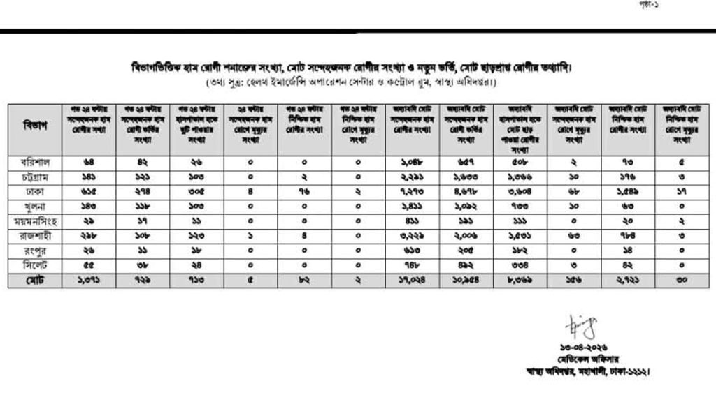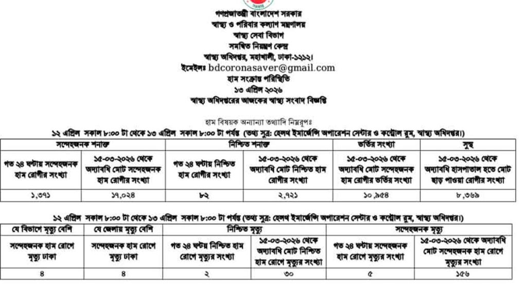 সোমবার (১৩ এপ্রিল) স্বাস্থ্য অধিদপ্তরের সমন্বিত নিয়ন্ত্রণ কেন্দ্র থেকে পাঠানো সংবাদ বিজ্ঞপ্তিতে এ তথ্য জানানো হয়েছে।